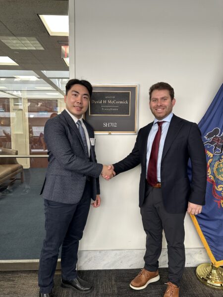 Eric Lin meets with staff from Senator David H. McCormick’s office following their discussion on materials science and federal R&D.