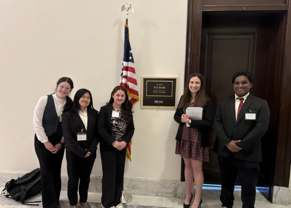 Undergraduate students from North Carolina State University meet with staff from Senator Ted Budd’s office. Left to right: Adriana Lara, Ariel Diem Nguyen, Cordelia McKelvy, and Aaron Thomas.